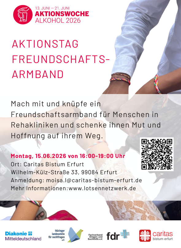 Am 15. Juni 2026 laden wir, die Referentinnen der Suchtselbsthilfe der Caritas, Diakonie, Thüringer Landesstelle für Suchtfragen e.V. und des Fachverbands Drogen- und Suchthilfe e.V. herzlich zu unserem Aktionstag im Rahmen der Aktionswoche Alkohol ein. An diesem Tag möchten wir gemeinsam mit Ihnen ein sichtbares Zeichen der Solidarität und Hoffnung setzen.